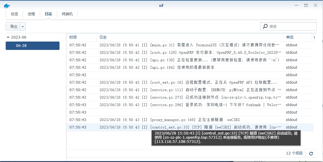 同时,您还可以双击进入容器,点击“日志”栏查看详细日志