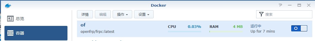 网页控制台中,打开“docker”,选择“容器”找到名叫“of”的容器,即可方便控制开启或关闭