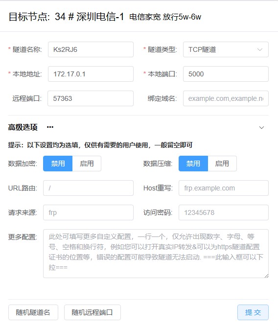 进入创建隧道栏,随便选一个节点,隧道名称随便填,本地端口选9,隧道类型选,剩下的不用管,可以选“随机远程端口”或者输一个喜欢的数字,点提交